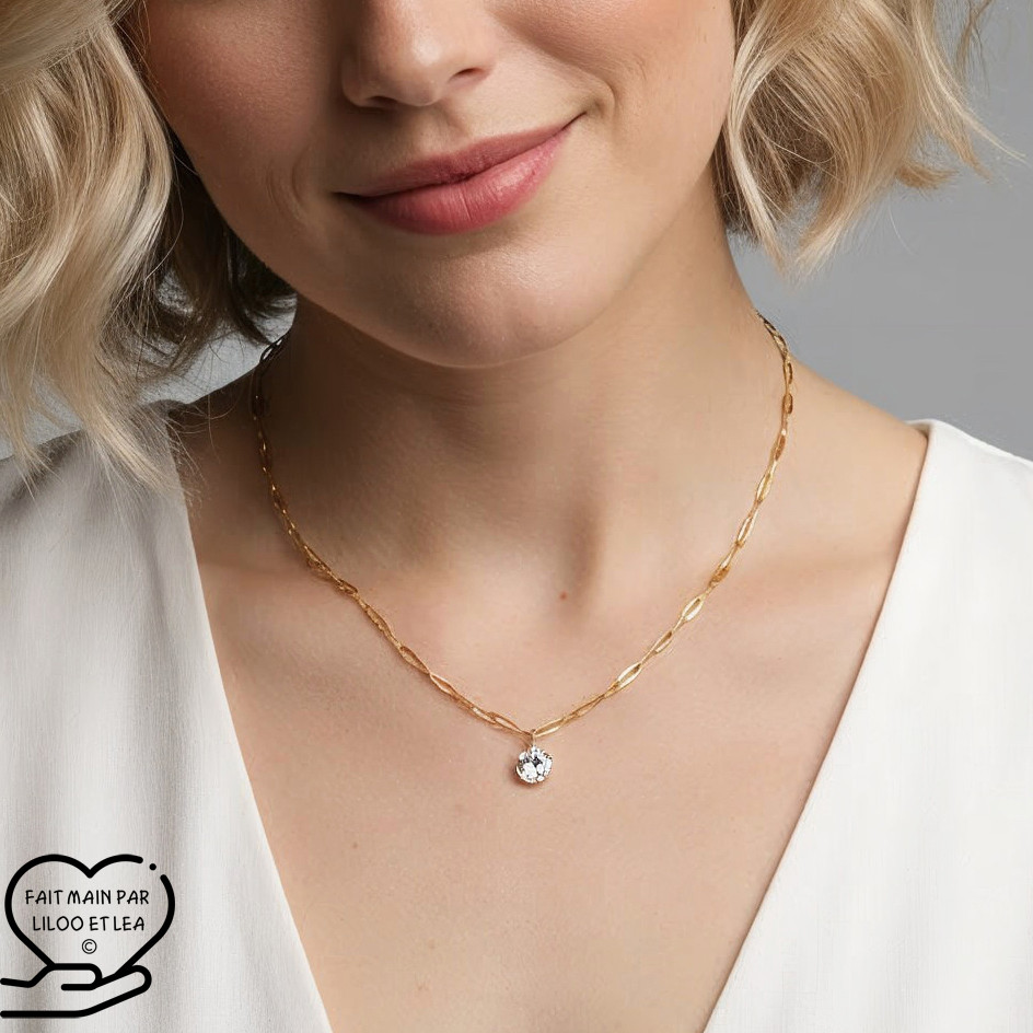 Necklace made of a 8 mm cubic zirconia solitaire pendant on a silver or gold stainless steel trombone link chain.