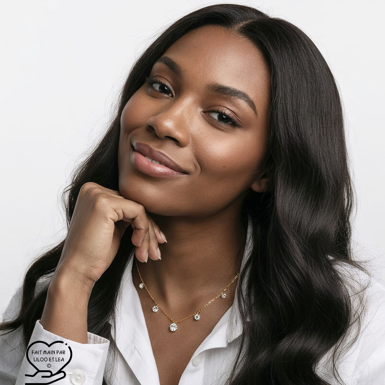Necklace made of five 4, 6 and 8 mm cubic zirconia on a silver or gold stainless steel satellite chain.
