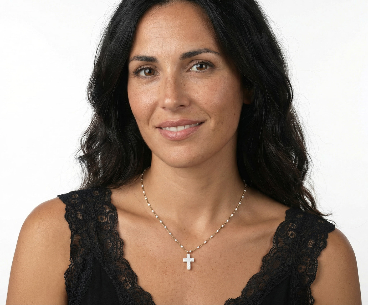 Collier croix chrétienne en nacre blanche naturelle sur chaîne câble perlée en émail blanc en acier inoxydable argent ou or.