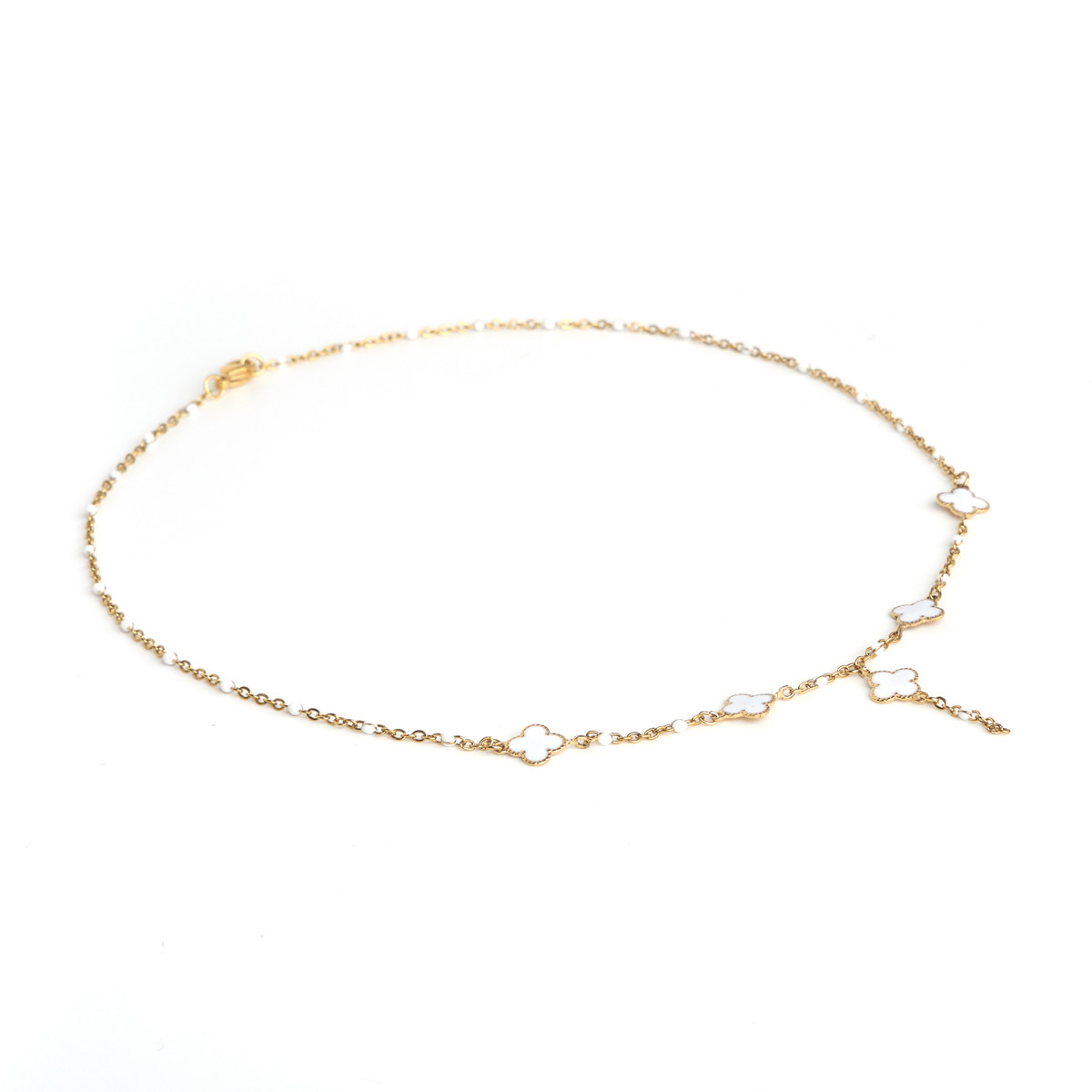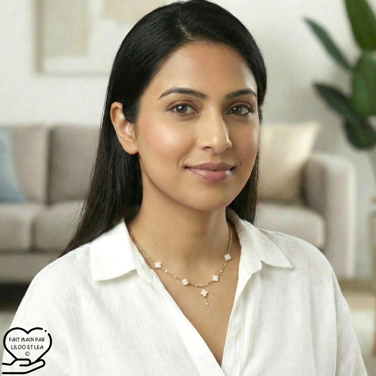Collier lariat (forme Y) en acier inoxydable argent ou or avec trèfles en émail blancs et chaîne perlée blanche.