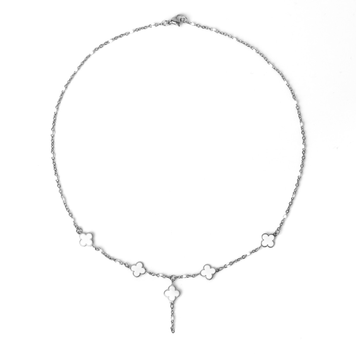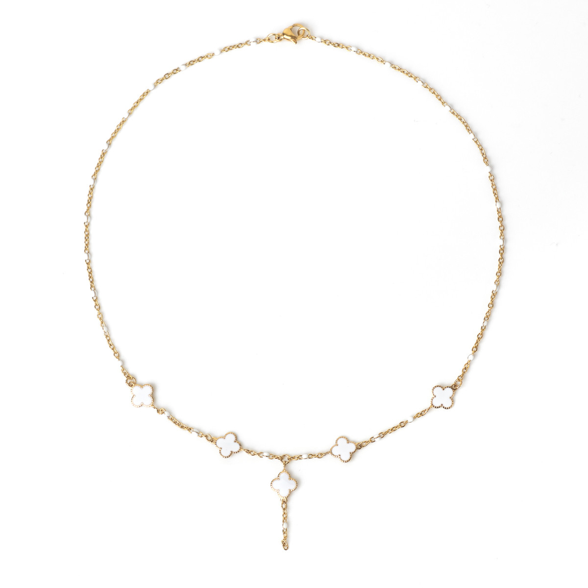 Collier en Y lariat trèfles en émail blancs sur acier inoxydable argent or cadeau femme