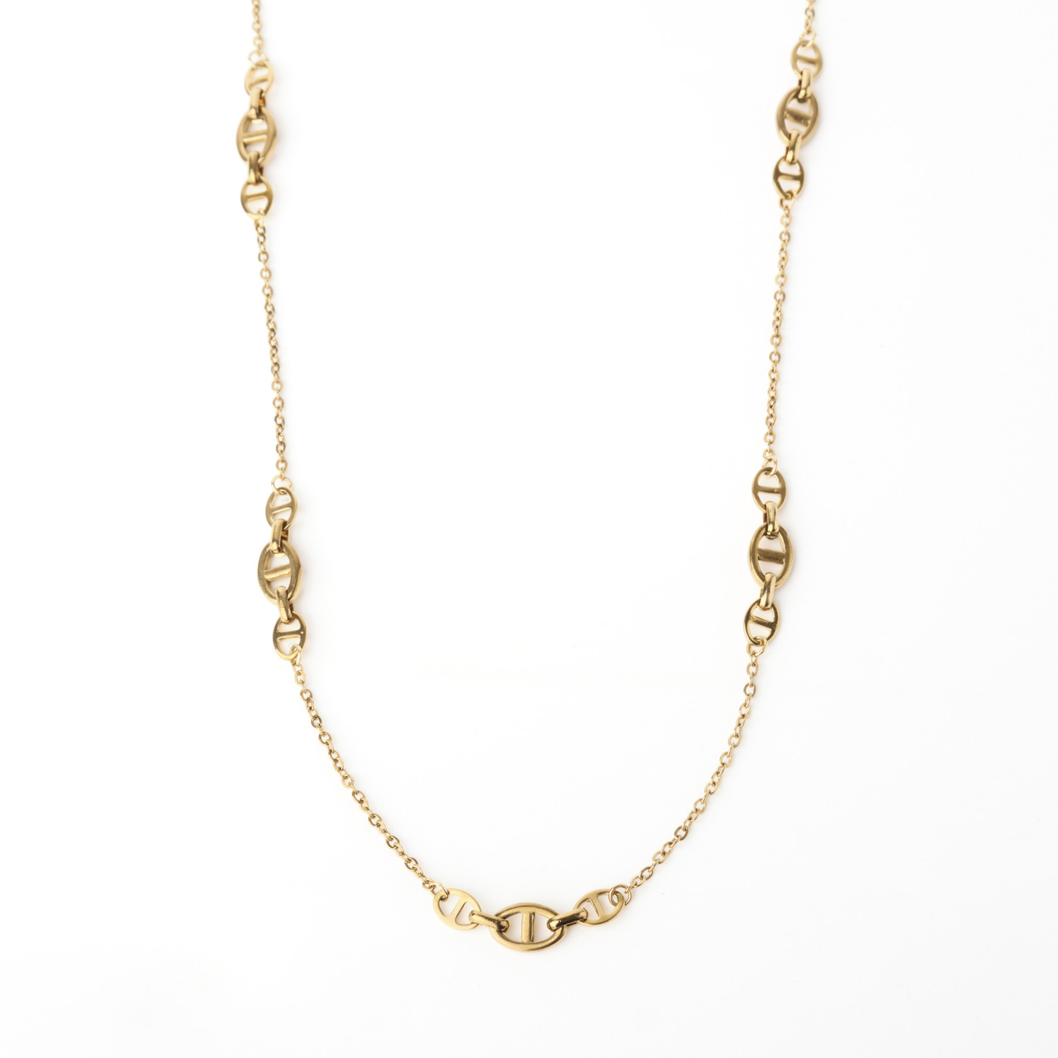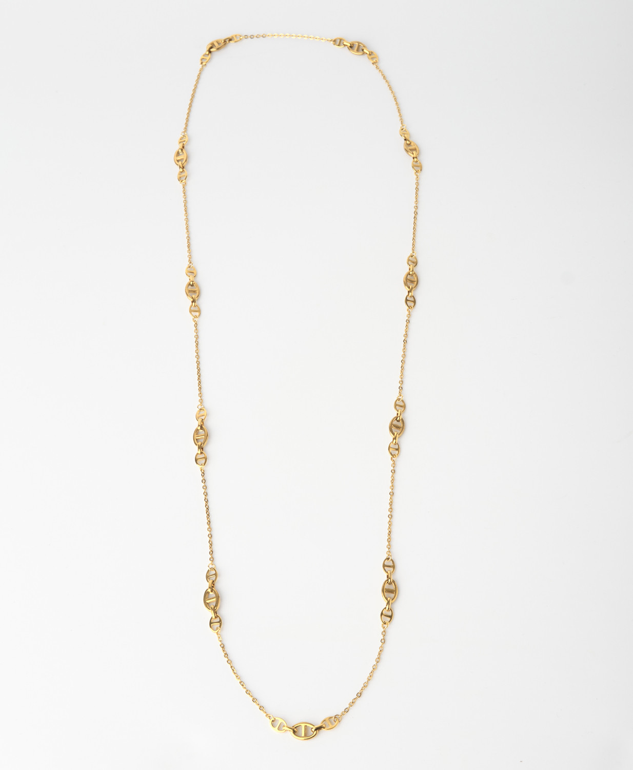 Sautoir collier long maille marine en acier inoxydable or. Disponible ici en finition argent.